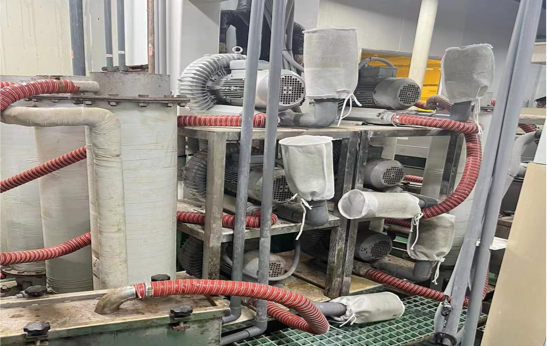 现场各种小管道及线槽、密布风机软管,风机出入口全部采用软管链接加卡箍链接,风管容易破损及脱落,环境温度过热,现场杂乱存在安全隐患,不便于检修及维护保养。